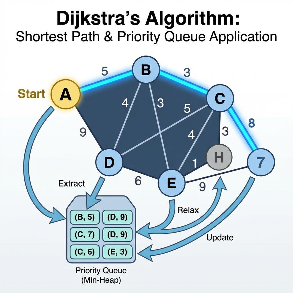 우리가 낯선 길을 갈 때 스마트폰에서 내비게이션 앱을 켜고 목적지를 입력하면, 단 1초도 지나지 않아 수백만 개의 도로 네트워크 속에서 '가장 빠르고 덜 막히는 최단 경로'를 화면에 그려줍니다. 도대체 컴퓨터는 그 복잡한 지도 데이터 속에서 어떻게 최단 거리를 순식간에 계산해 내는 것일까요? 이 경이로운 기술의 중심에는 1956년 천재 컴퓨터 과학자 에츠허르 다익스트라(Edsger W. Dijkstra)가 고안한 '다익스트라 알고리즘(Dijkstra Algorithm)'이 자리 잡고 있습니다. 하나의 시작점으로부터 다른 모든 정점까지의 최단 경로를 구하는 이 알고리즘은, 단순한 반복문에서 시작해 '우선순위 큐(Priority Queue)'를 만나며 완벽한 성능 최적화를 이루어냈습니다. 오늘 이 글에서는 다익스트라 알고리즘의 동작 원리와 O(E log V)라는 놀라운 시간 복잡도를 달성한 우선순위 큐의 응용 기법을 완벽하게 파헤쳐 봅니다.