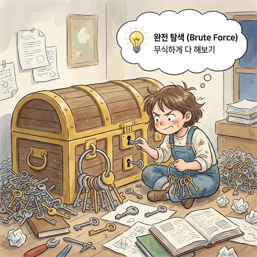 알고리즘이라고 하면 뭔가 수학적이고 세련된 공식을 써서 문제를 우아하게 해결하는 장면이 떠오르시나요? 하지만 컴퓨터 과학에서 가장 기본이 되면서도 가장 강력한 문제 해결 방법은 의외로 "무식하게 다 해보기"입니다. 이를 전문 용어로 완전 탐색, 영어로는 브루트 포스(Brute Force)라고 부릅니다. 'Brute(짐승)'와 'Force(힘)'의 합성어로, 머리를 쓰는 대신 압도적인 계산 능력으로 밀어붙인다는 뜻입니다. "비효율적인 거 아니야?"라고 생각할 수 있지만, 컴퓨터의 연산 속도를 믿고 정답을 100% 보장하는 가장 확실한 방법이기도 합니다.