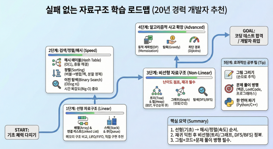 자료구조와 알고리즘 공부에는 효율적인 로드맵(Roadmap)이 존재합니다. 기초 체력을 먼저 다지고, 그 위에 기술을 쌓아야 탈이 나지 않습니다. 비전공자나 입문자도 체계적으로 실력을 쌓아 올릴 수 있는, 20년 경력 개발자가 추천하는 '실패 없는 자료구조 학습 순서'를 제시해 드립니다.