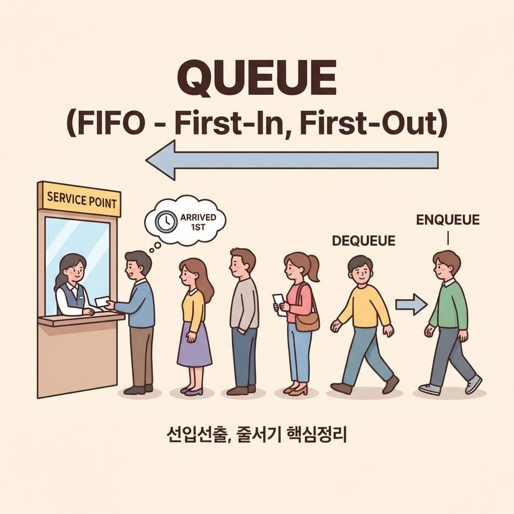 큐의 제1원칙은 선입선출(FIFO)입니다. "가장 먼저 들어온 것이 가장 먼저 나간다"는 뜻입니다.