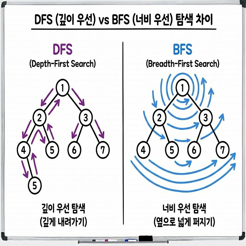| 구분 | DFS (깊이 우선) | BFS (너비 우선) |