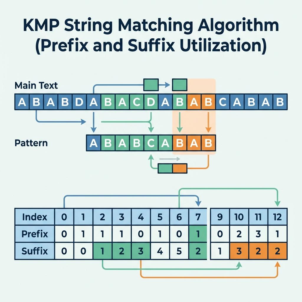 KMP 알고리즘은 "불일치가 발생하기 직전까지 일치했던 문자열 안에, 이미 반복되는 패턴이 들어있다면 그 부분은 굳이 다시 처음부터 검사하지 말고 건너뛰자(Shift)"는 아이디어에서 출발합니다. 이를 위해 패턴 문자열 자체를 미리 분석하여 LPS (Longest Proper Prefix which is also Suffix) 테이블을 구축해야만 합니다.